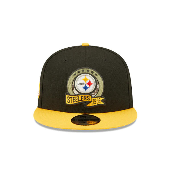 Pittsburgh Steelers New Era NFL 9FIFTY 950 Snapback Cap Hat Black Crown Yellow Visor Camo Logo (2022 Salute To Service)