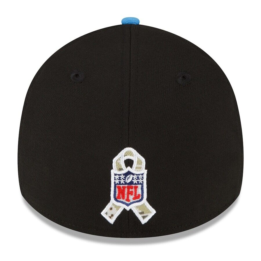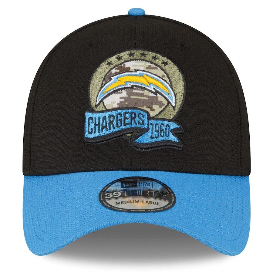 Los Angeles Chargers New Era NFL 39THIRTY 3930 Flexfit Cap Hat Black Crown Sky Blue Visor Team Color Logo (2022 Salute To Service)