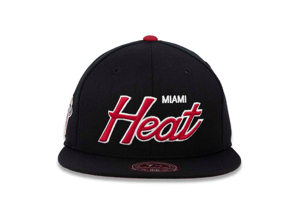 Miami Heat Mitchell & Ness NBA Fitted Cap Hat Black Crown/Visor Red/White Text/Script Logo