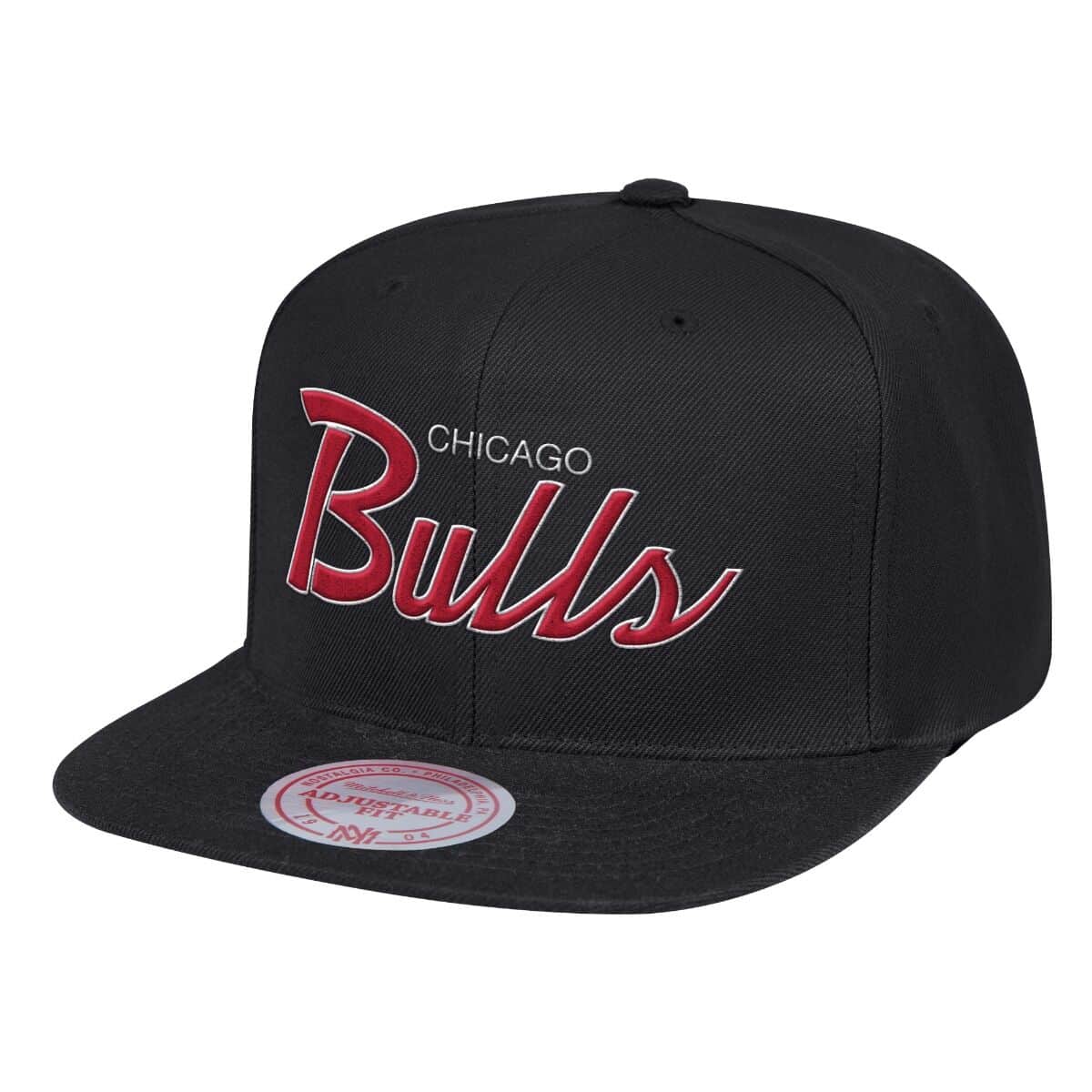 Chicago Bulls Mitchell & Ness NBA Snapback Cap Hat Black Crown/Visor Team Color Satin Script Logo Team Logo Side Patch