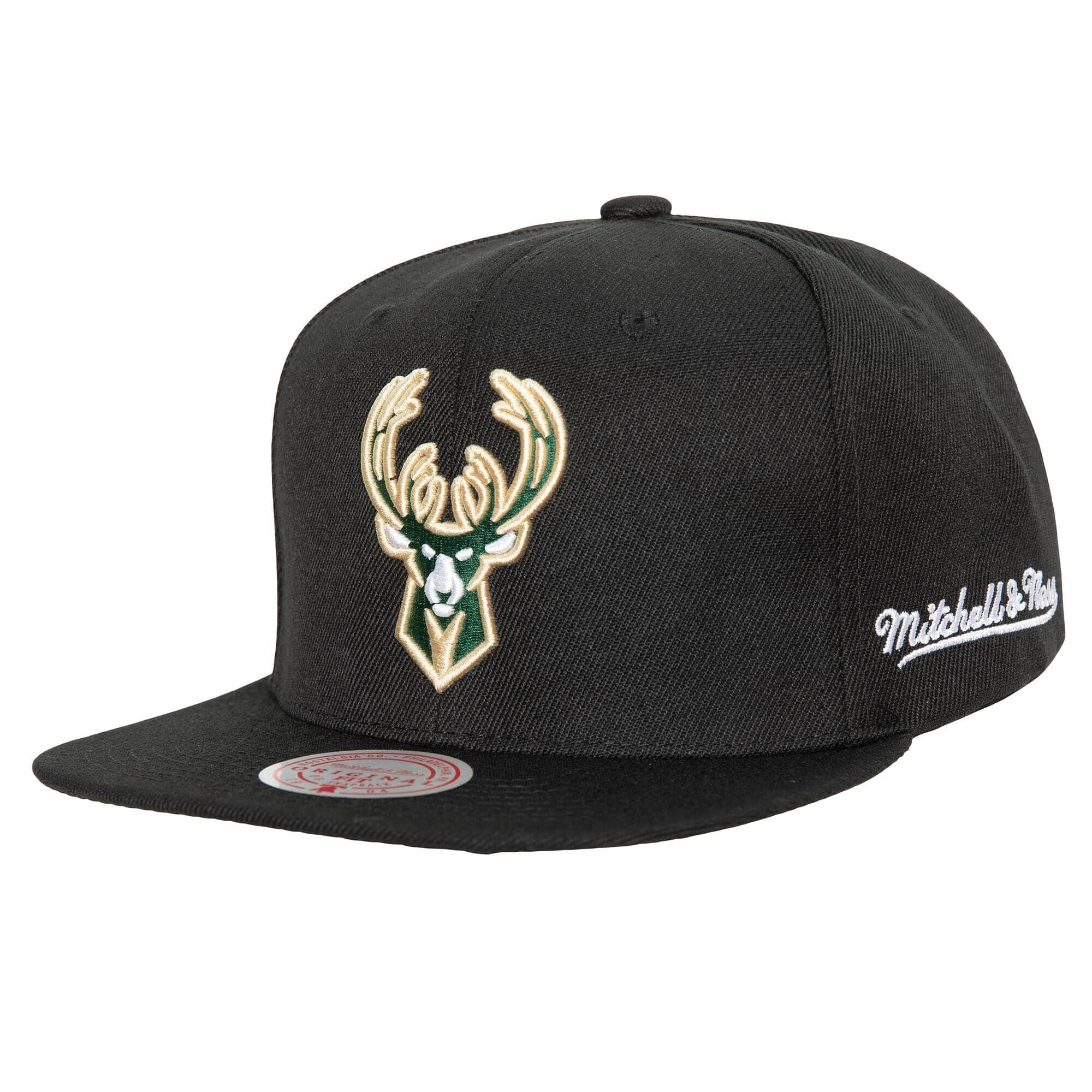 Milwaukee Bucks Mitchell & Ness NBA Snapback Cap Hat Black Crown/Visor Team Color Logo English Text/Script Back Logo