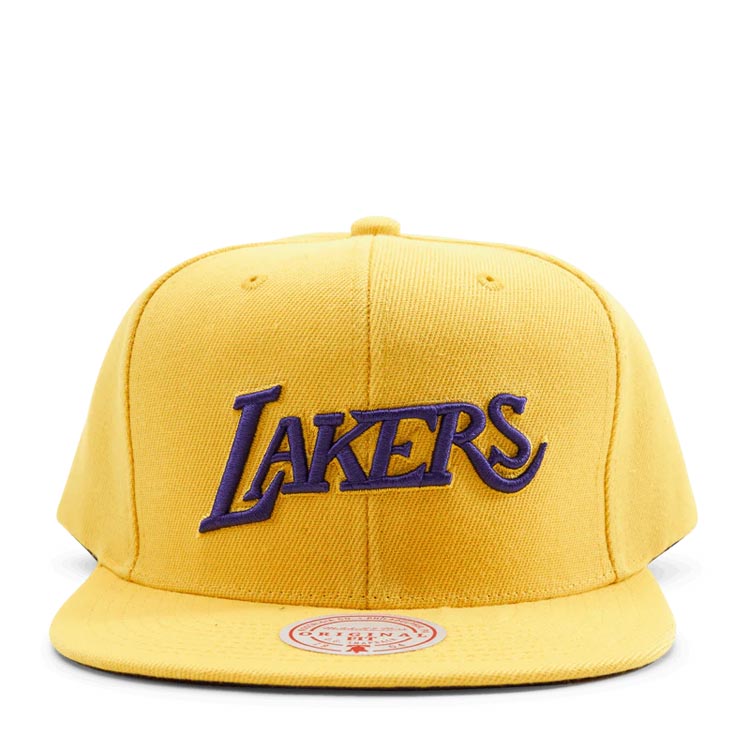 Los Angeles Lakers Mitchell & Ness NBA Snapback Cap Hat Yellow Crown/Visor Purple Text Logo